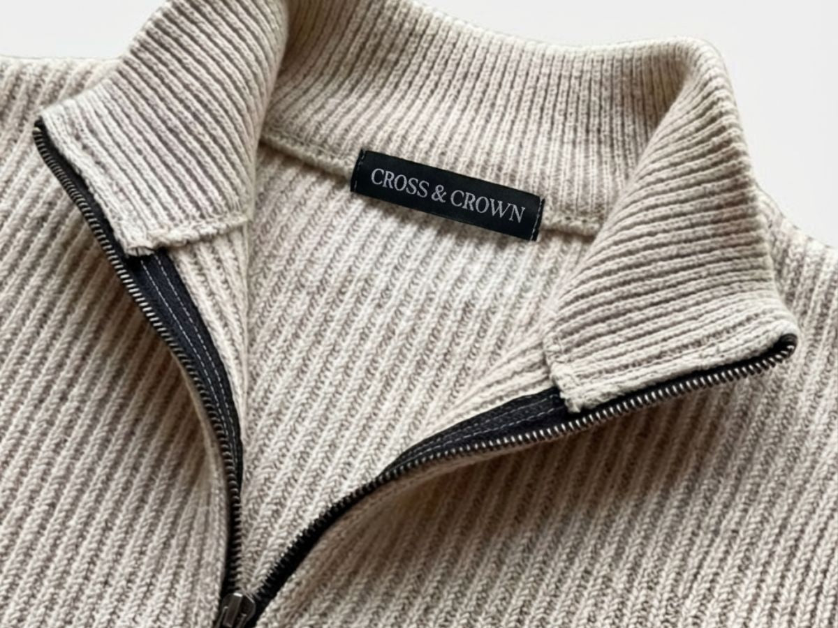 Every Cross Crown sweater follows a proprietary high-collar construction — engineered to hold shape, frame the neckline, and maintain elegance over time.